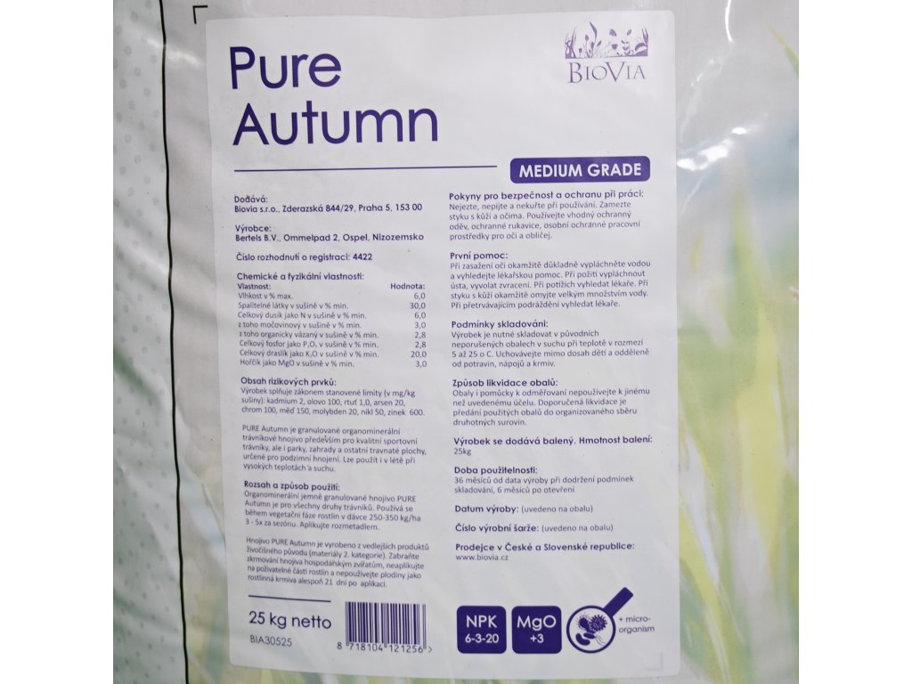 Přípravek Autumn 6-3-20+3MgO je ideální hnojivo k použití v průběhu podzimního období. S vynikajícími výsledky je rovněž možno jej použít na začátku jara. Vysoká dávka draslíku zaručuje, že travina dokáže odolat nástupu zimy a měnícím se povětrnostním podmínkám, jako je zima a sucho. Pomalé uvolňování organicky vázaného dusíku zajišťuje postupný růst trávy. Hořčík obsažený v přípravku Autumn navíc udržuje barvu trávy sytě zelenou a má přímý účinek proti tvorbě mechu.