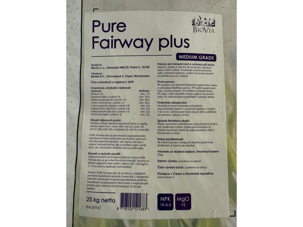 Přípravek Fairway Plus 20-3-5+2MgO postupně uvolňuje oba použité zdroje dusíku a brání růstovým špičkám. Minerální močovinový dusík zaručuje rychlý start (CH₄N₂O). Přidaný hořčík (MgO) dává trávníku krásnou zelenou barvu.